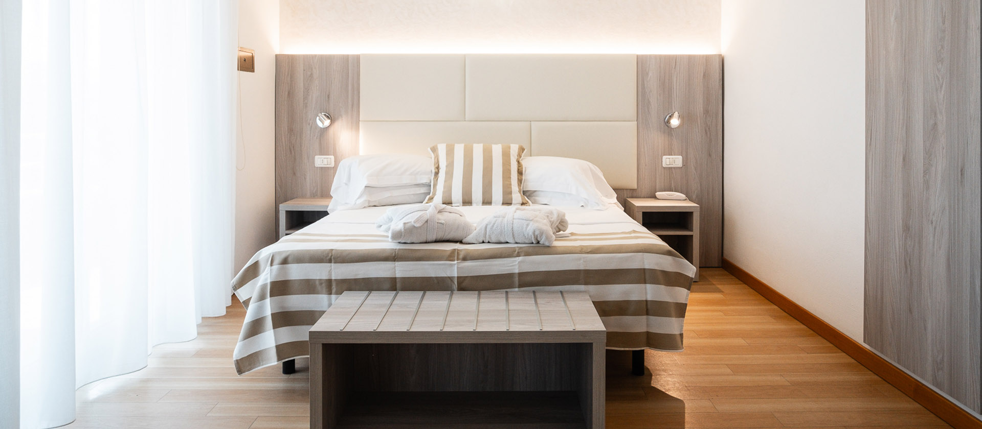 The SUPERIOR rooms are located at the front of the hotel, on the first floor, with balconies overlooking the internal garden and the public gardens. Adult guests also have access to bathrobes .