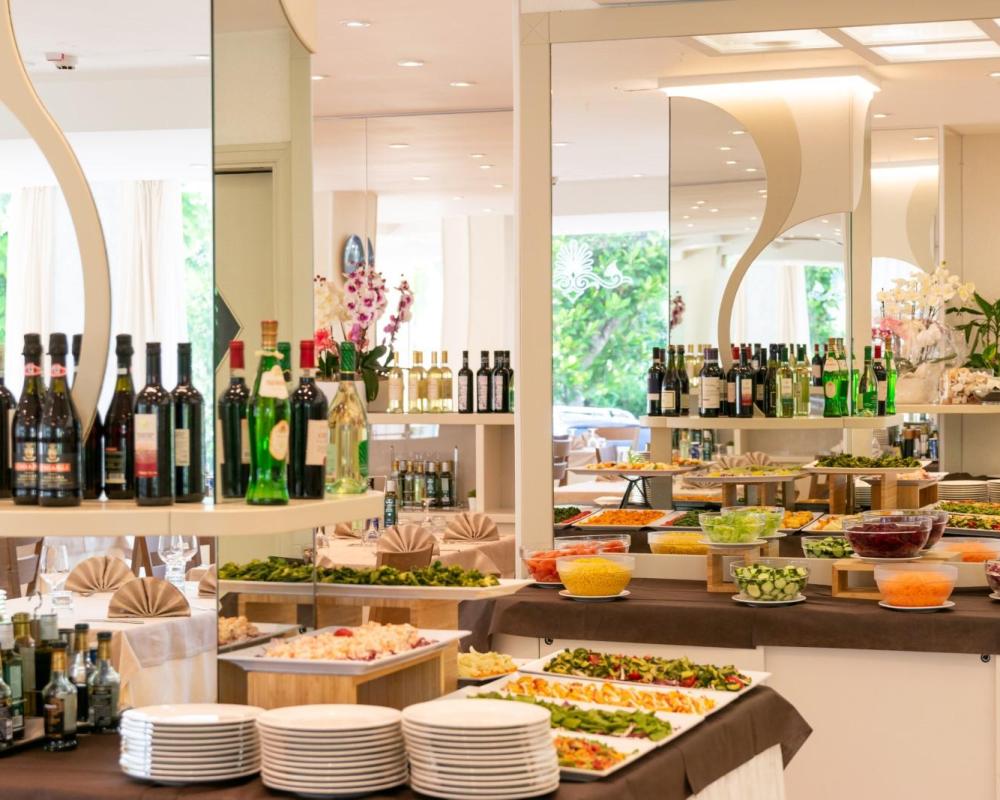A pranzo è disponibile un buffet di insalate e crudità, mentre la sera antipasti, verdure cotte e crude e, per concludere, dolci a scelta, gelato o frutta di stagione.