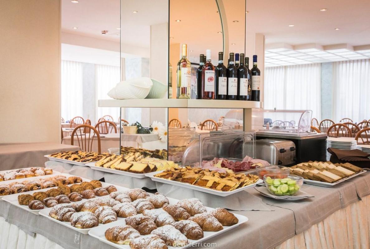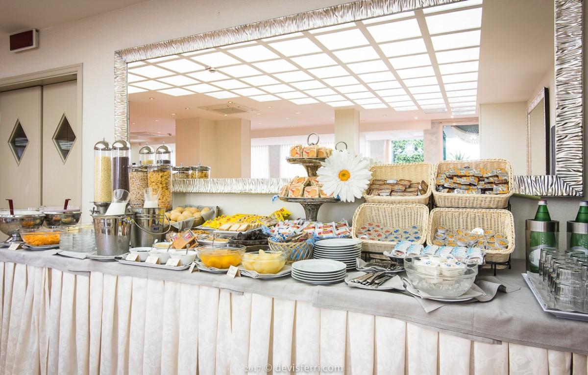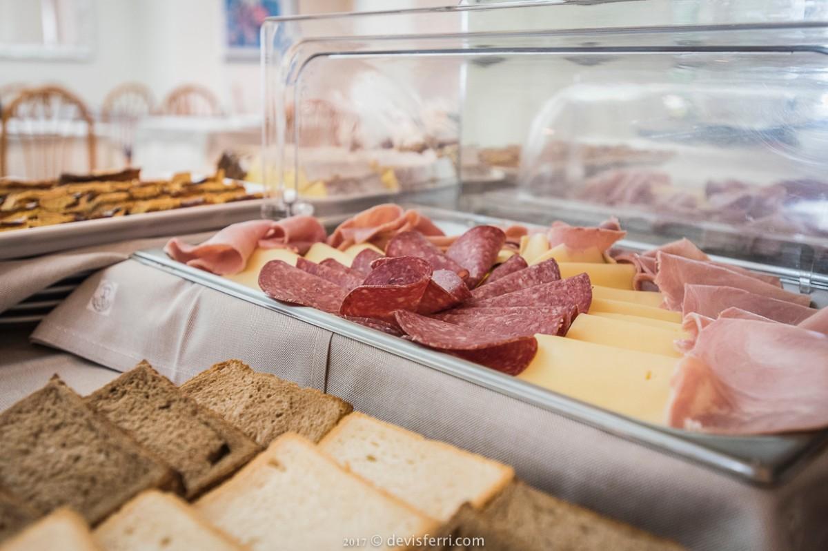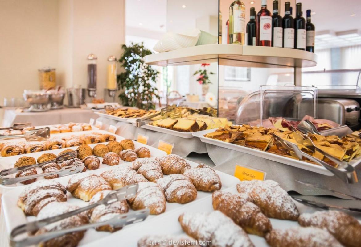 Il buffet propone un'ampia selezione di dolce e salato: cioccolata Nutella, marmellate, fette biscottate, biscotti, dolci fatti in casa e brioche, insieme a salumi, formaggi, panini, yogurt, latte fresco, di soya, di mandarle, di riso, no lattosio, cereali e prodotti biologici. Su richiesta, vengono preparate uova al momento.